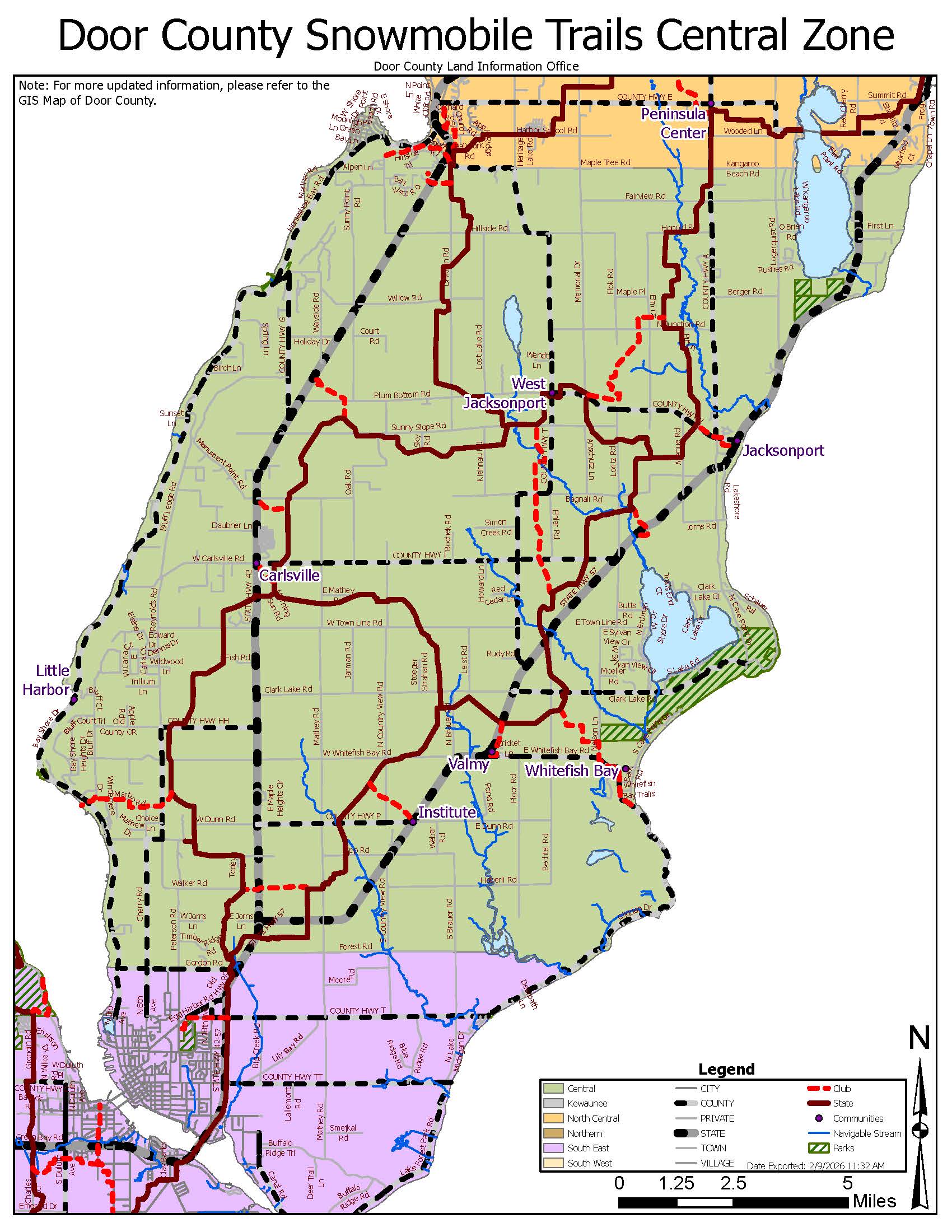 Trails are from County Road EE (Egg Harbor to Baileys Harbor) south to Gordon Road on the north edge of Sturgeon Bay.